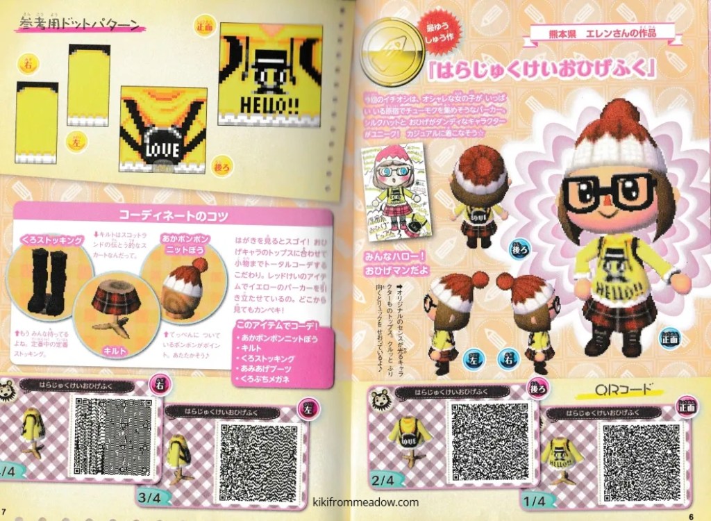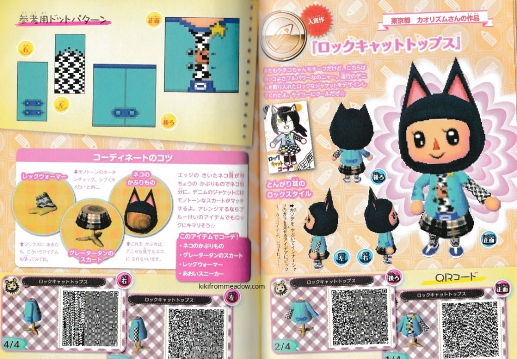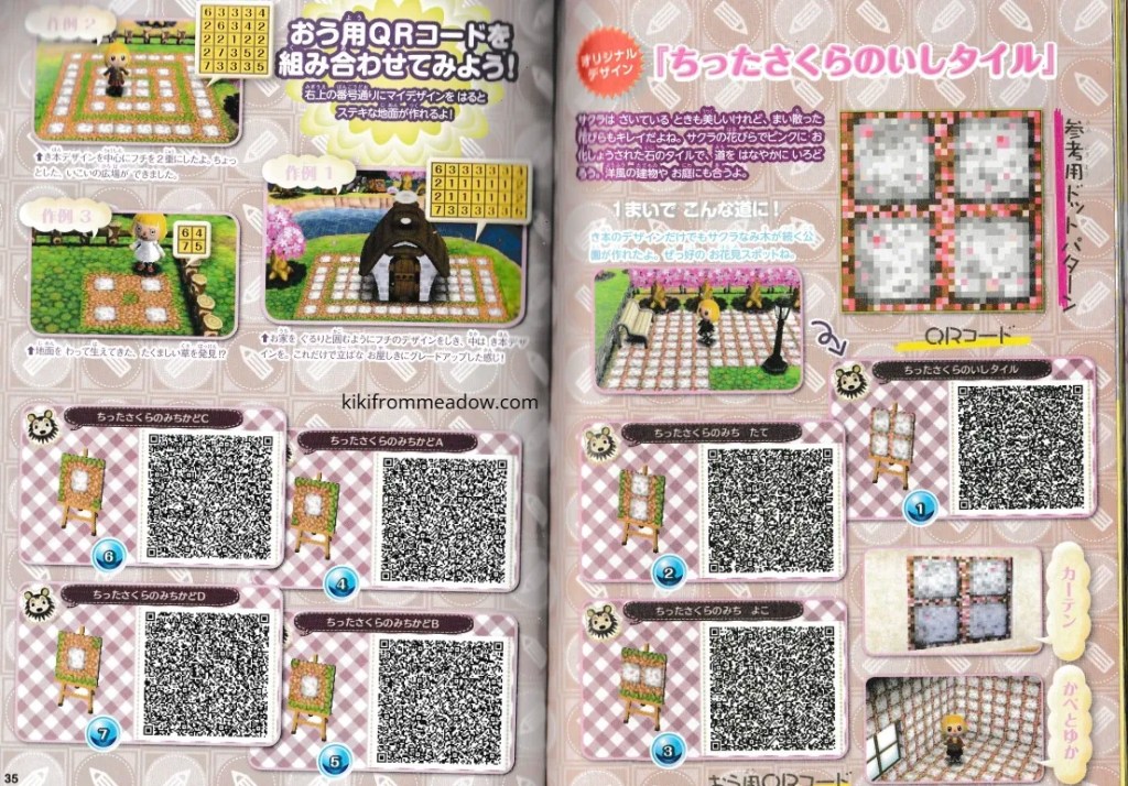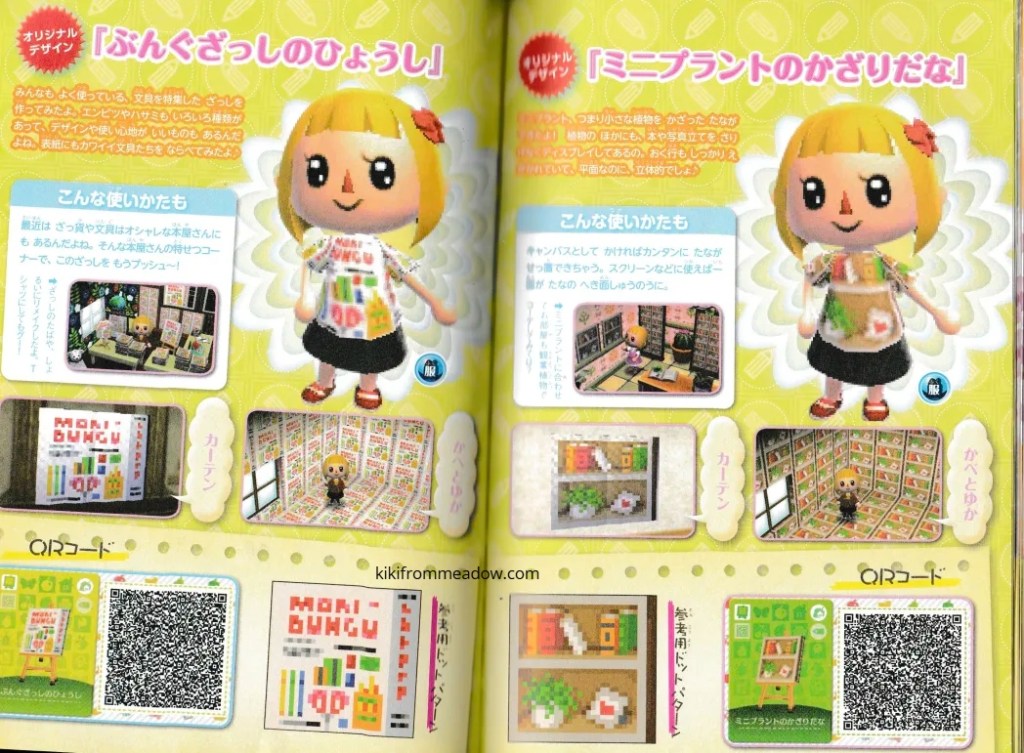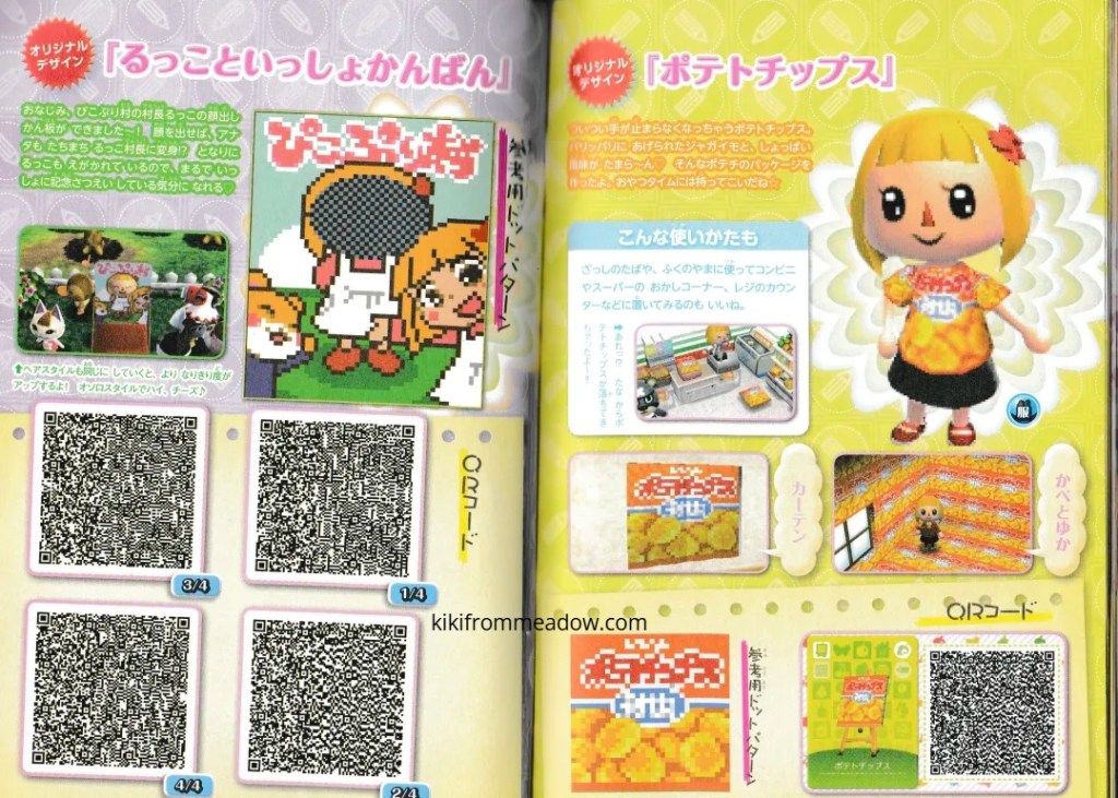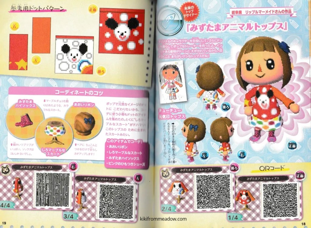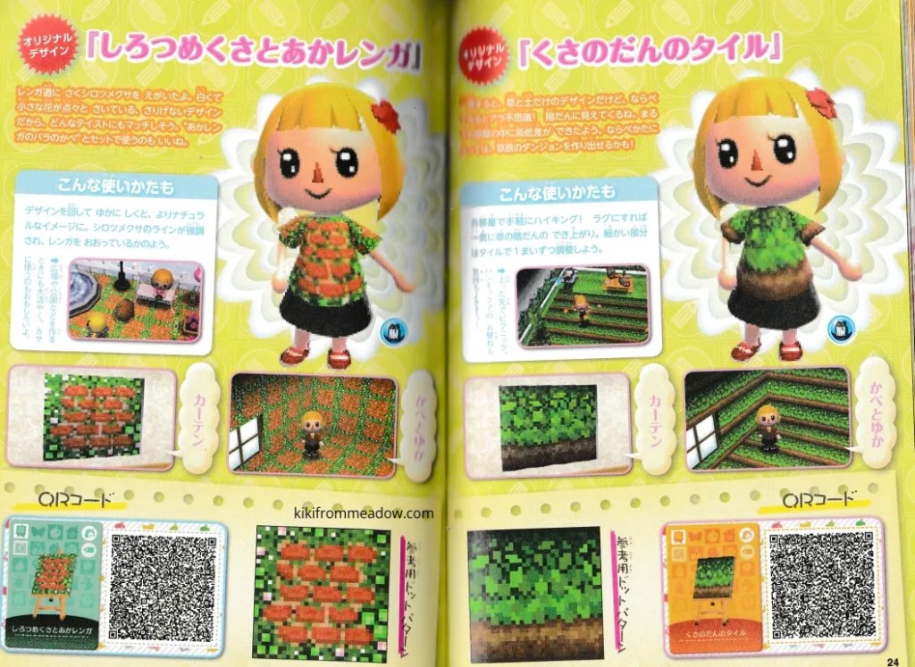 I purchased some Japanese exclusive pikopuri AC:NL magazines that have QR codes on them so I thought I will upload them here so that these creations are archived somewhere on the internet! 🙂 I will be using Google translate to translate the name of the designs below the page in case you’re wondering what it’s called in English – please note that Google translate might be inaccurate so the translated titles may not be accurate to what they’re actually called in Japanese. The creator of the designs will be credited below the translated title.
