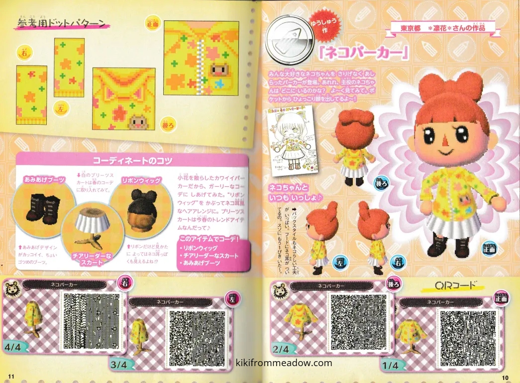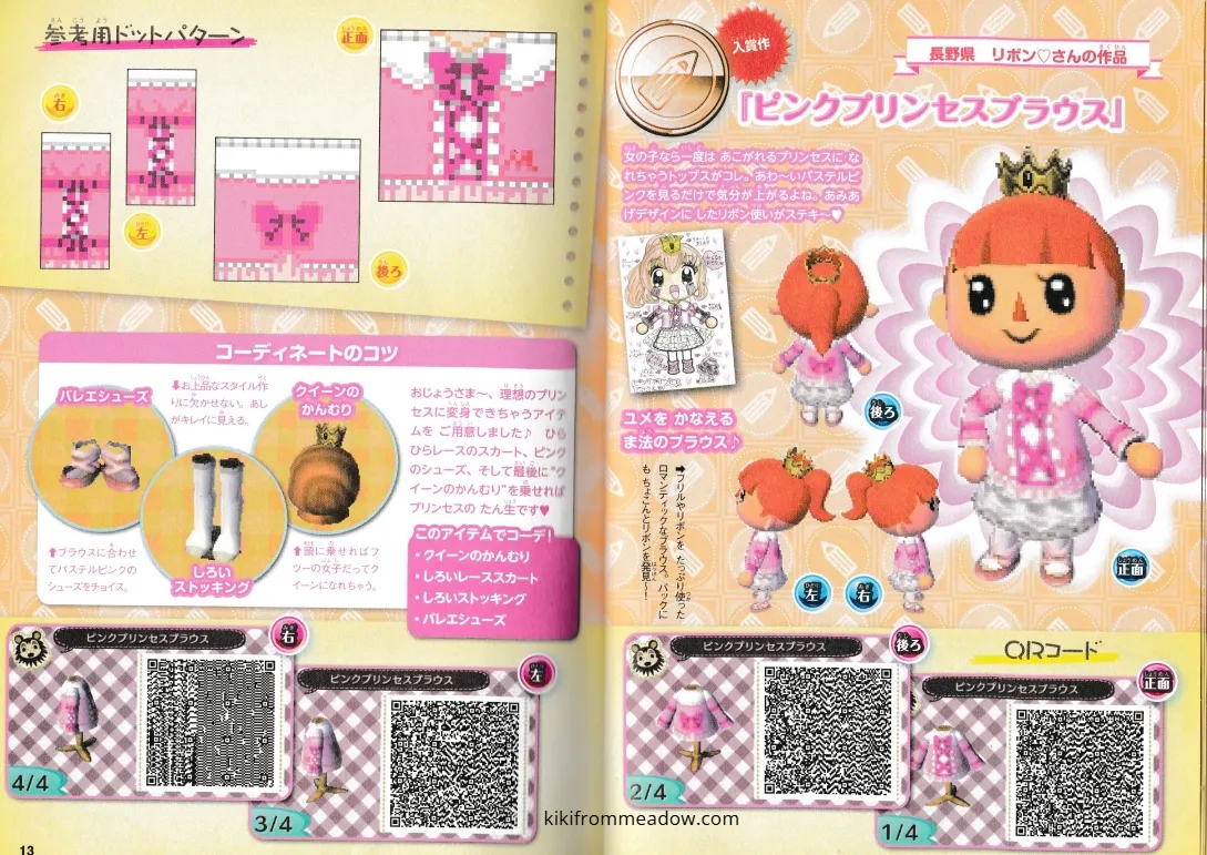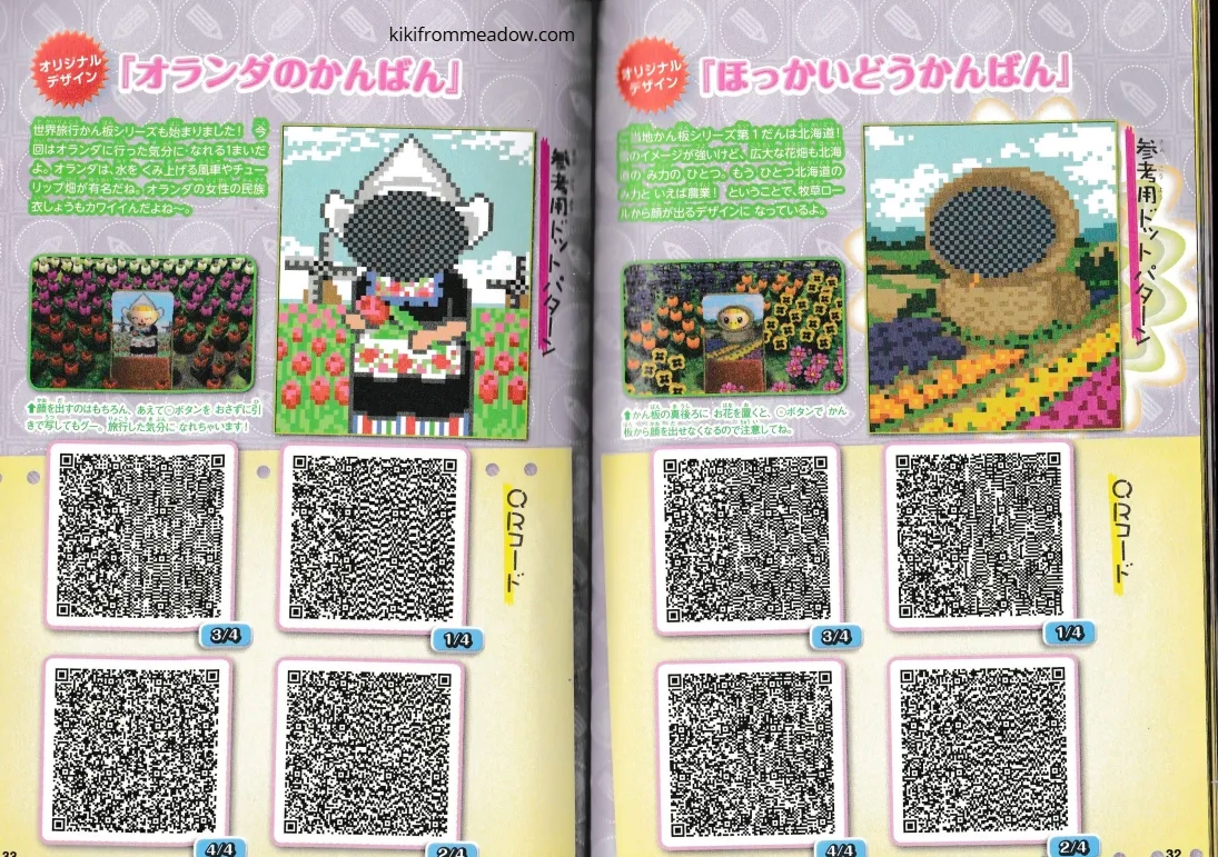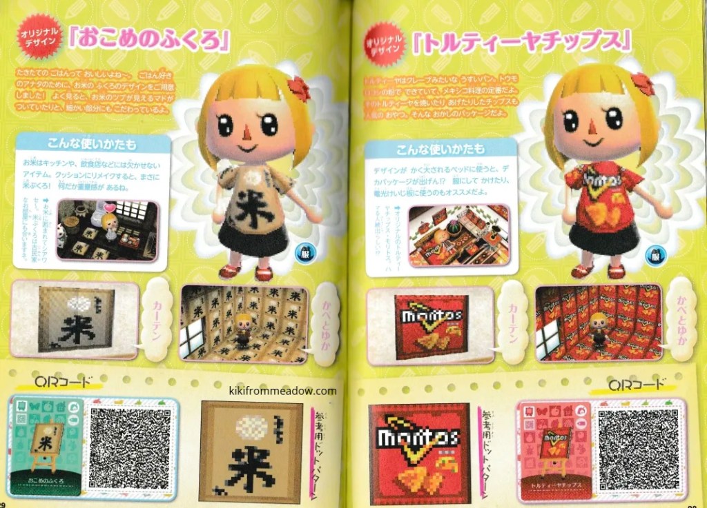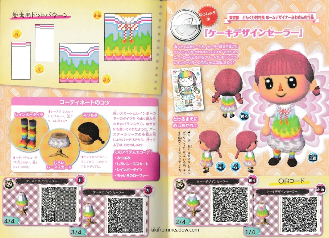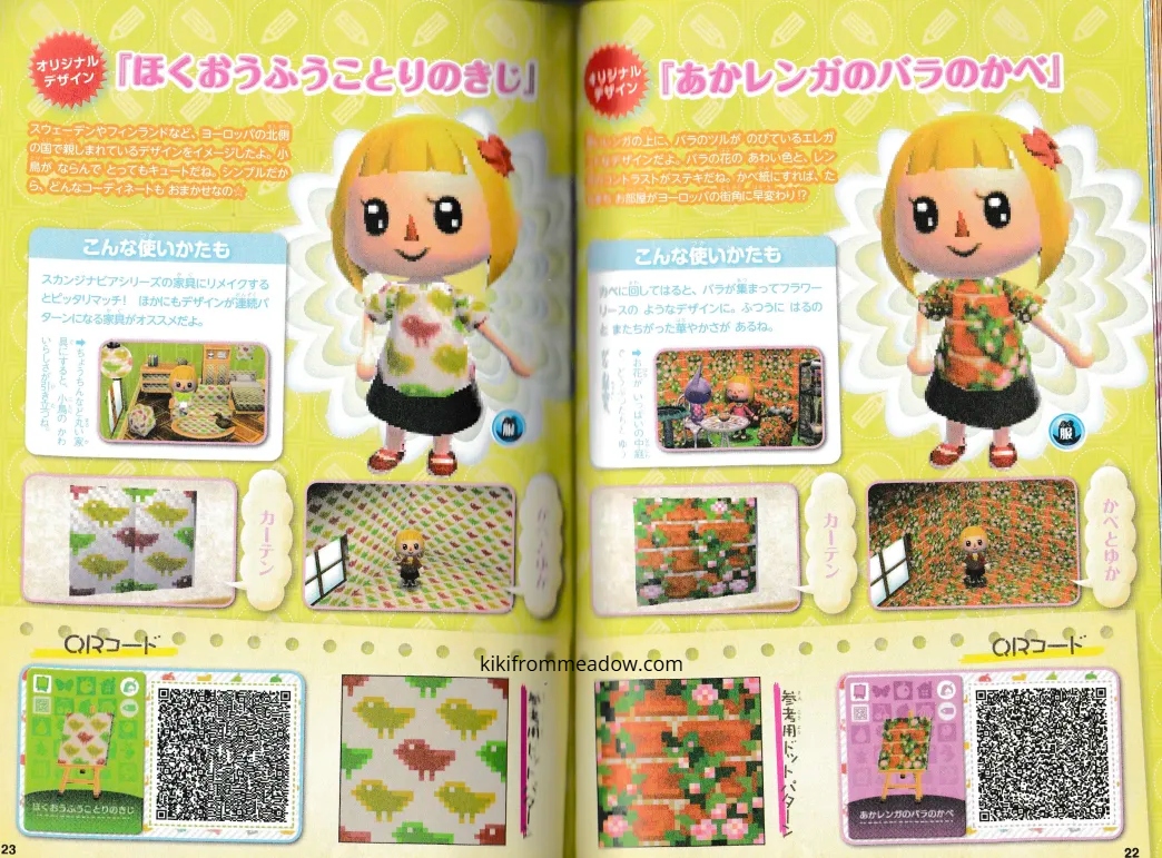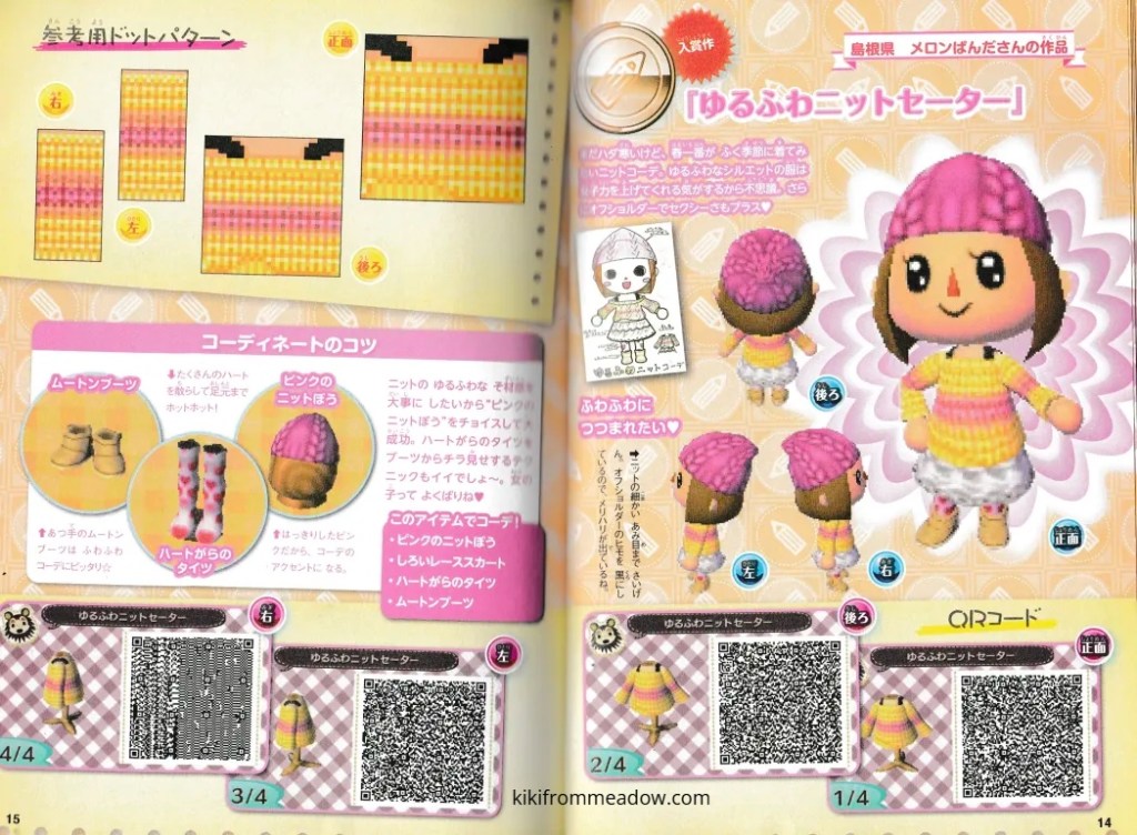 I purchased some Japanese exclusive pikopuri AC:NL magazines that have QR codes on them so I thought I will upload them here so that these creations are archived somewhere on the internet! 🙂 I will be using Google translate to translate the name of the designs below the page in case you’re wondering what it’s called in English – please note that Google translate might be inaccurate so the translated titles may not be accurate to what they’re actually called in Japanese. The creator of the designs will be credited below the translated title.
